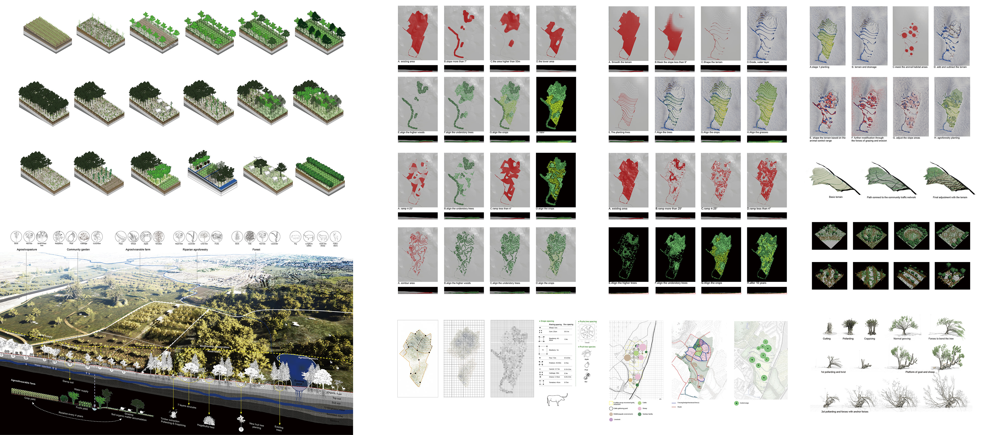 The experiment starts at the central area by using Houdini (software) to design the food planting mode, considering slope and agroforestry strategies. It establishes a sound plant-water-soil structure with contour-based trees and food planting.